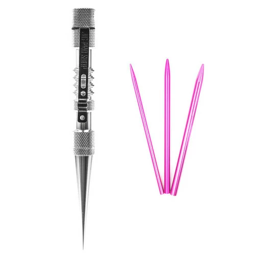 The Knotter’s Tool is made from billet aircraft aluminum and has a durable, high-luster anodized silver finish. Included is a spring metal clip for precision etching, hole in one end for a keyring/lanyard, and it is also diamond knurled to provide a positive grip.  Also included are three different size pink metal stitching needles! This is an excellent tool for loosening and tightening knots of all types of rope/cord!
