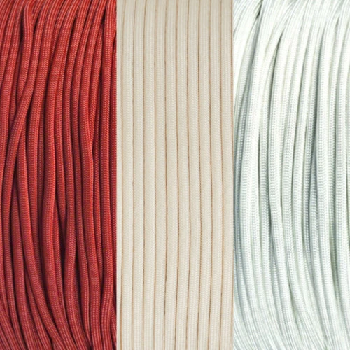 This kit contains 100 feet of the following USA made, 550 paracord colors: Cream, Crimson & White