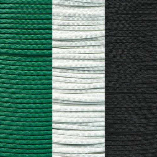 This kit contains 100 feet of the following USA made, 550 paracord colors: Black, Kelly Green, & White