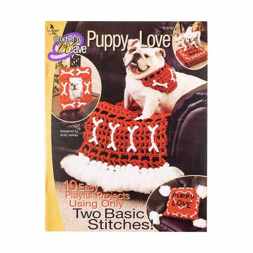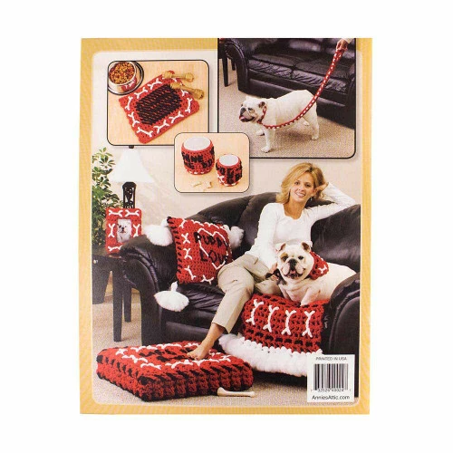 This 14 page book includes 10 crochet patterns for dog accessories. Patterns include a collar, bandanna, leash, small and large canister, photo frame, sofa saver, place mat, pet cushion, and a pillow. Directions include basic crochet and stitching guide. Cord recommended for completing the projects are 4mm or 6mm Bonnie Braid.