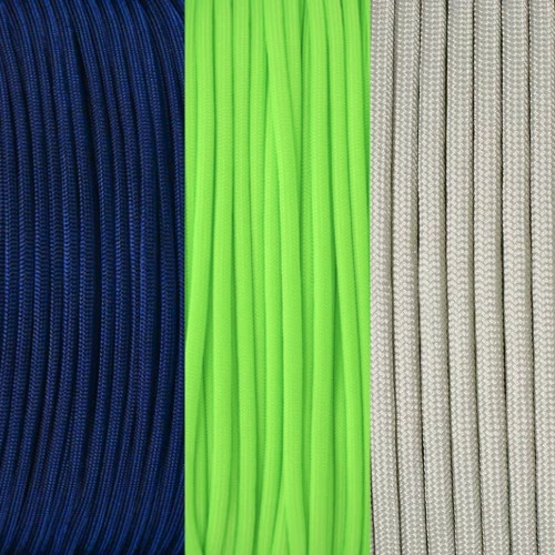 This kit contains 100 feet of the following USA made, 550 paracord colors: Midnight Blue, Neon Green, & Silver Gray