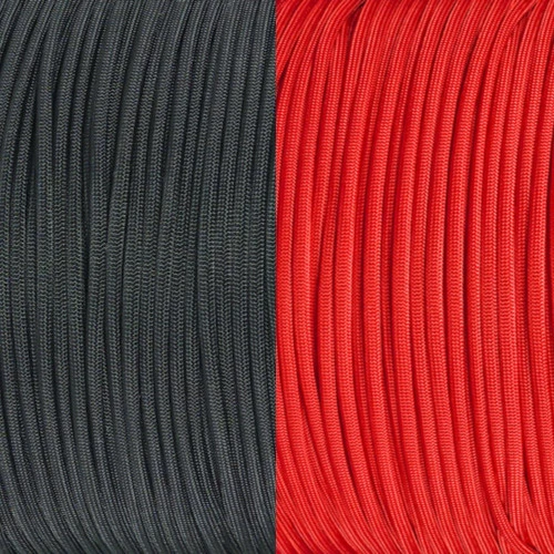 This kit contains 100 feet of the following USA made, 550 paracord colors: Black & Imperial Red
