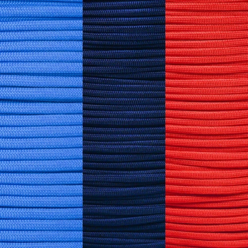 This kit contains 100 feet of the following USA made, 550 paracord colors: Royal Blue, Midnight Blue, & Imperial Red